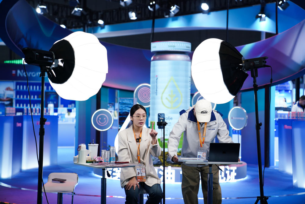 2025年11月4日,工作人員在第八屆進(jìn)博會醫(yī)療器械及醫(yī)藥保健展區(qū)直播。本屆進(jìn)博會直播密度大、形式多樣,有的展位專門搭建直播區(qū)域,燈光、背景、展板一應(yīng)俱全;有的展位手機(jī)一架、產(chǎn)品一擺,直播就地開始;還有的直播間是“流動的”,達(dá)人主播們拿著手機(jī)、別著麥克風(fēng),穿梭于各個品牌展位間現(xiàn)場推薦……八年來,進(jìn)博會影響力逐年遞增,越來越多的中國消費(fèi)者愿意通過直播了解進(jìn)博會上的“全球好物”。