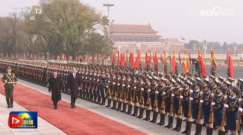 費(fèi)利佩六世抵達(dá)時(shí),禮兵列隊(duì)致敬。習(xí)近平同費(fèi)利佩六世登上檢閱臺(tái),軍樂(lè)團(tuán)奏中西兩國(guó)國(guó)歌,天安門廣場(chǎng)鳴放禮炮21響。費(fèi)利佩六世在習(xí)近平陪同下檢閱中國(guó)人民解放軍儀仗隊(duì),并觀看分列式。