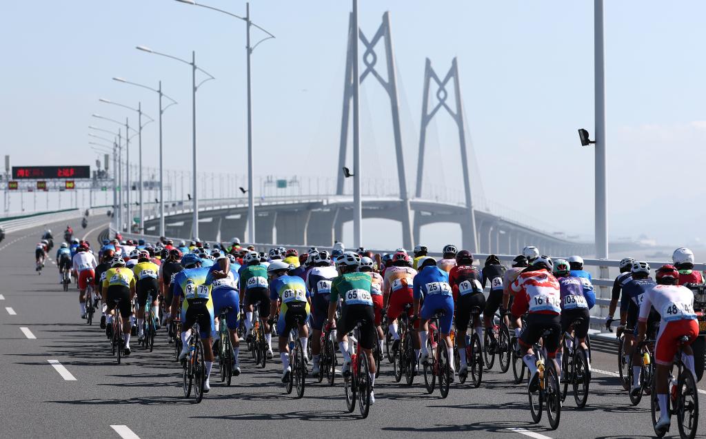 11月8日,參賽選手在港珠澳大橋騎行。當(dāng)日進(jìn)行的第十五屆全國運(yùn)動會公路自行車男子個(gè)人賽,賽道全程231.8公里,選手經(jīng)過港珠澳大橋,跨越粵港澳三地。圖源:新華社