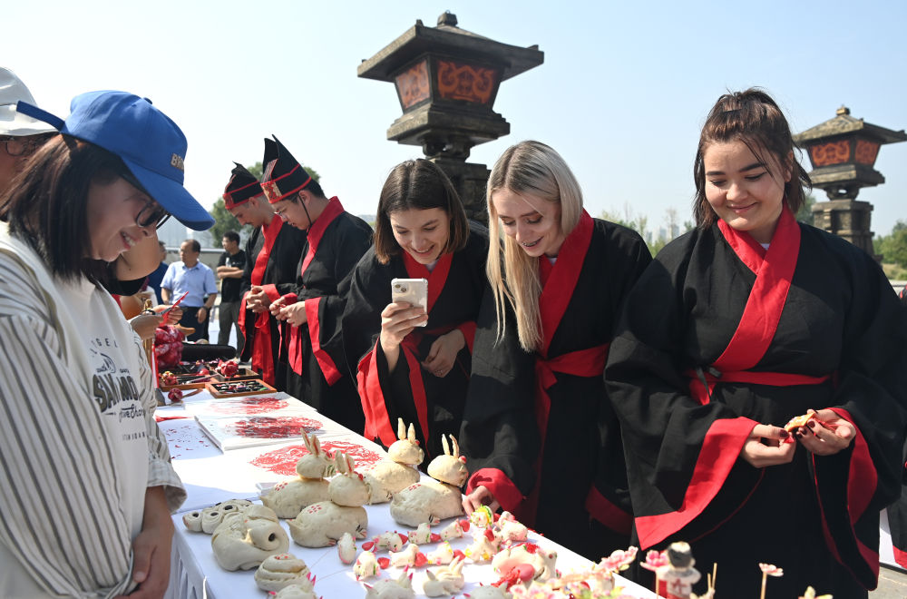 2023年9月16日,“絲路起點 文明根脈”2023西安絲路留學生交流活動在西安啟動,來自西安交通大學的百名中外大學生著漢服、行漢禮,通過沉浸式體驗,了解中國傳統文化。這是中外大學生在交流活動上了解陜西非遺。