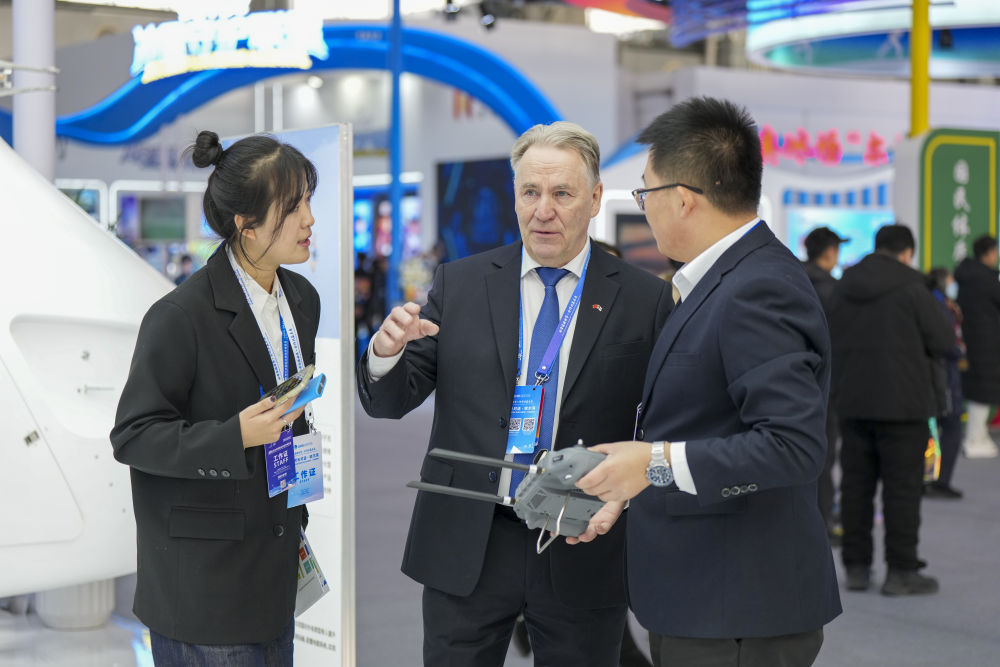 1月6日,在2026哈爾濱國際冰雪經(jīng)濟(jì)博覽會(huì)現(xiàn)場(chǎng),參會(huì)嘉賓(中)在了解一款工業(yè)無人機(jī)的參數(shù)和性能。新華社記者 王松 攝
