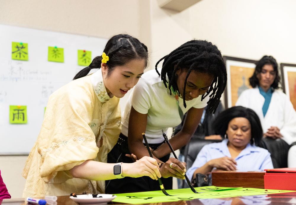 2025年4月17日,在南非約翰內(nèi)斯堡,學(xué)生與孔子學(xué)院志愿者在“國際中文日”活動上寫毛筆字。