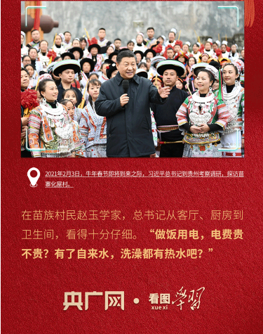 2020年底,貴州最后9個深度貧困縣退出貧困縣序列。次年2月,總書記就專程來到曾經的深度貧困村——貴州省畢節(jié)市化屋村。在苗族村民趙玉學家里,總書記看得仔細、問得真切,“做飯用電,電費貴不貴?有了自來水,洗澡都有熱水吧?”一句句家常話,嘮的是具體事,暖的是百姓心。