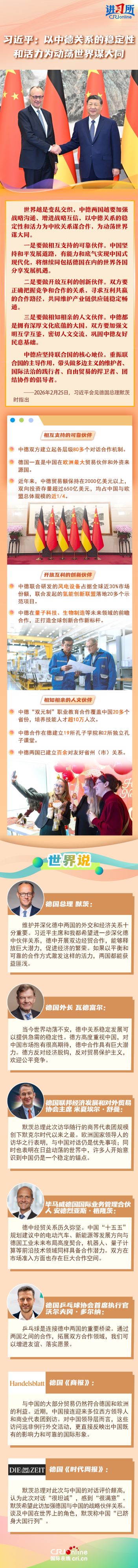 2月25日,中國國家主席習(xí)近平在北京會見來華進(jìn)行正式訪問的德國總理默茨,就下一步中德關(guān)系發(fā)展提出三點(diǎn)意見:一是要做相互支持的可靠伙伴、二是要做開放互利的創(chuàng)新伙伴、三是要做相知相親的人文伙伴。習(xí)近平指出,世界越是變亂交織,中德兩國越要加強(qiáng)戰(zhàn)略溝通、增進(jìn)戰(zhàn)略互信,以中德關(guān)系的穩(wěn)定性和活力為中歐關(guān)系謀合作,為動蕩世界謀大同。