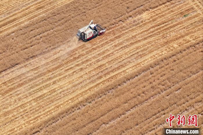 資料圖:江蘇南京,工作人員駕駛農(nóng)機在江北一處田間收割小麥。(無人機照片)中新社記者 泱波 攝