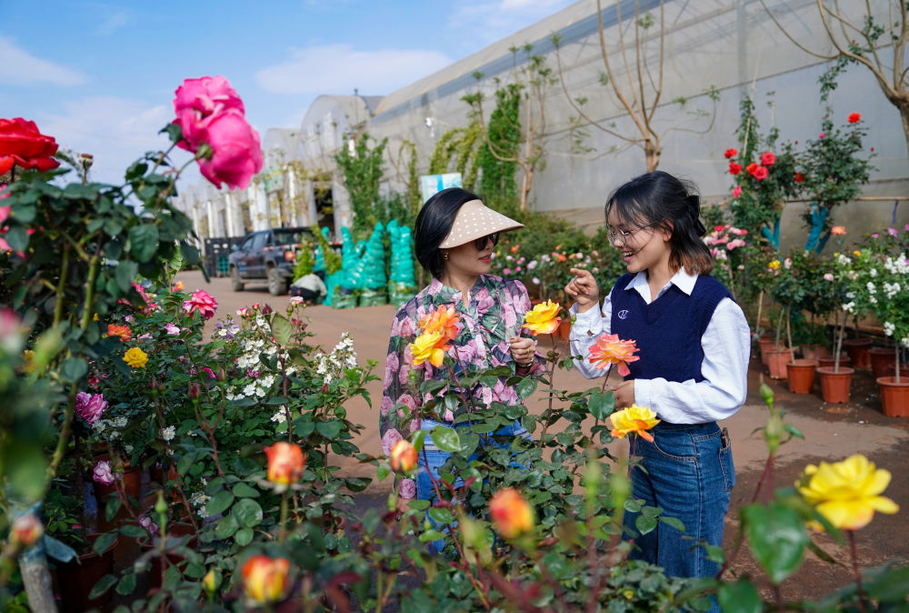 2025年4月11日,越南花商阮翠云(左)與翻譯李青歌在云南昆明斗南一花卉基地內(nèi)查看鮮花品質(zhì)。2018年,阮翠云開始在越南銷售云南花卉,讓七彩“云花”成為眾多越南家庭的“??汀?。借助高效的電商平臺和快捷的物流網(wǎng)絡(luò),鮮花從云南花田到河內(nèi)貨架實現(xiàn)了“次日達(dá)”。