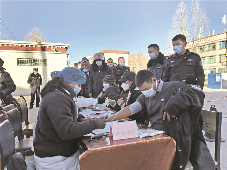 自2021年1月1日起,拉薩市在各縣(區(qū))設置26個新冠疫苗接種點,按照知情同意、自愿接種的原則,優(yōu)先對重點人群進行疫苗接種工作。圖為1日上午,在達孜區(qū)人民醫(yī)院,醫(yī)護人員正在對公安干警及群眾進行血壓檢測和詢問既往病史等,并與他們簽訂新冠病毒疫苗接種同意書。拉薩融媒記者 范江英攝