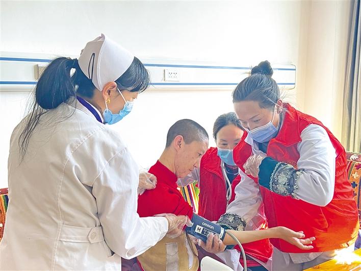 圖為志愿者們協(xié)助醫(yī)生,給那曲市殘疾人聯(lián)合會殘疾人康復(fù)托養(yǎng)中心的患者測量血壓。記者 萬靖 攝