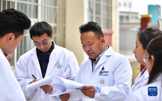 普窮次仁和學(xué)生們一起學(xué)習中醫(yī)藥相關(guān)政策(4月20日攝)。新華社記者 晉美多吉 攝