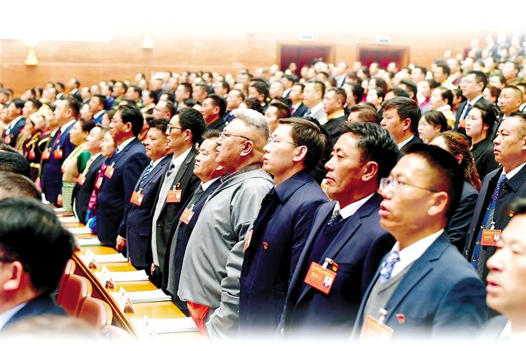 圖為自治區(qū)人大代表們齊唱國歌。 記者 潘多 攝