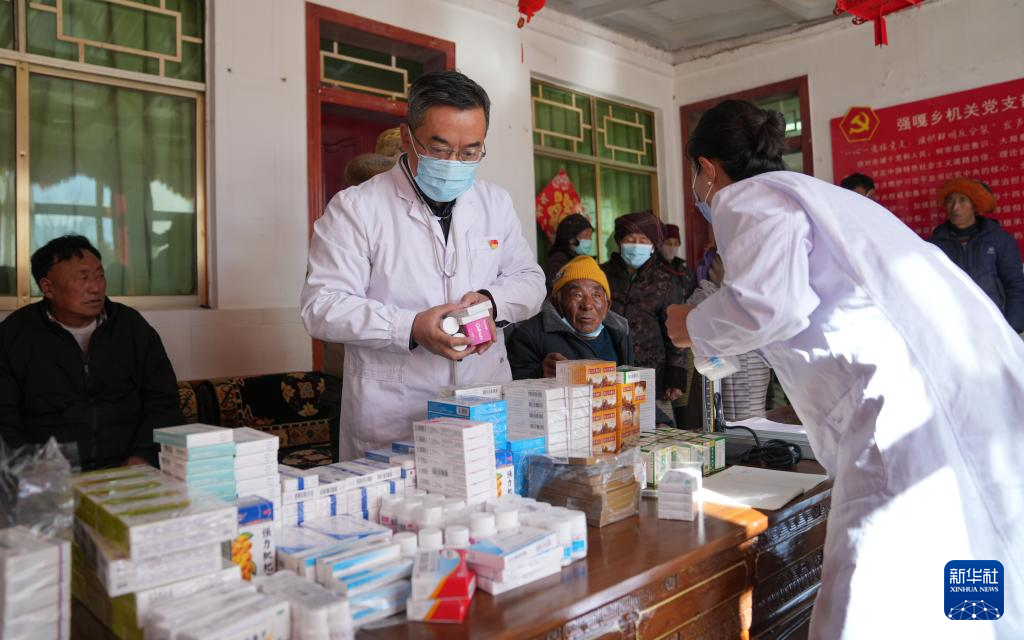 1月24日,西藏大學醫(yī)學院熊海教授給患者發(fā)放藥品。新華社記者 晉美多吉 攝 ??