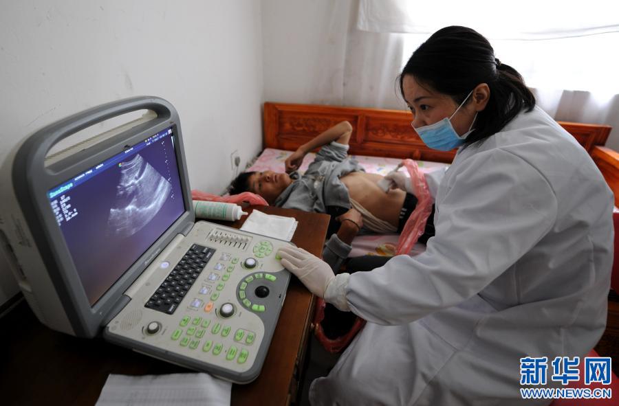 安徽省援藏醫(yī)療人員在西藏山南市錯那縣勒門巴民族鄉(xiāng)為當(dāng)?shù)卮迕馚超檢查腹腔,進(jìn)行包蟲病篩查(2017年8月7日攝)。新華社記者 晉美多吉 攝