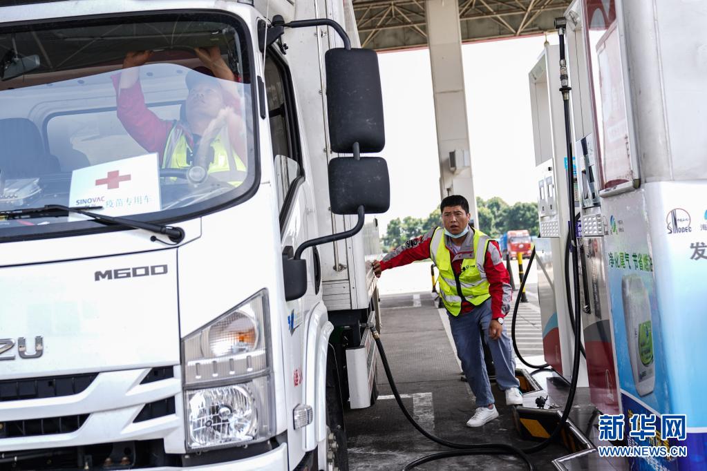7月22日,在運(yùn)送疫苗途中,司機(jī)蘆艷會(huì)在加油站給車加油。新華社記者 彭子洋 攝