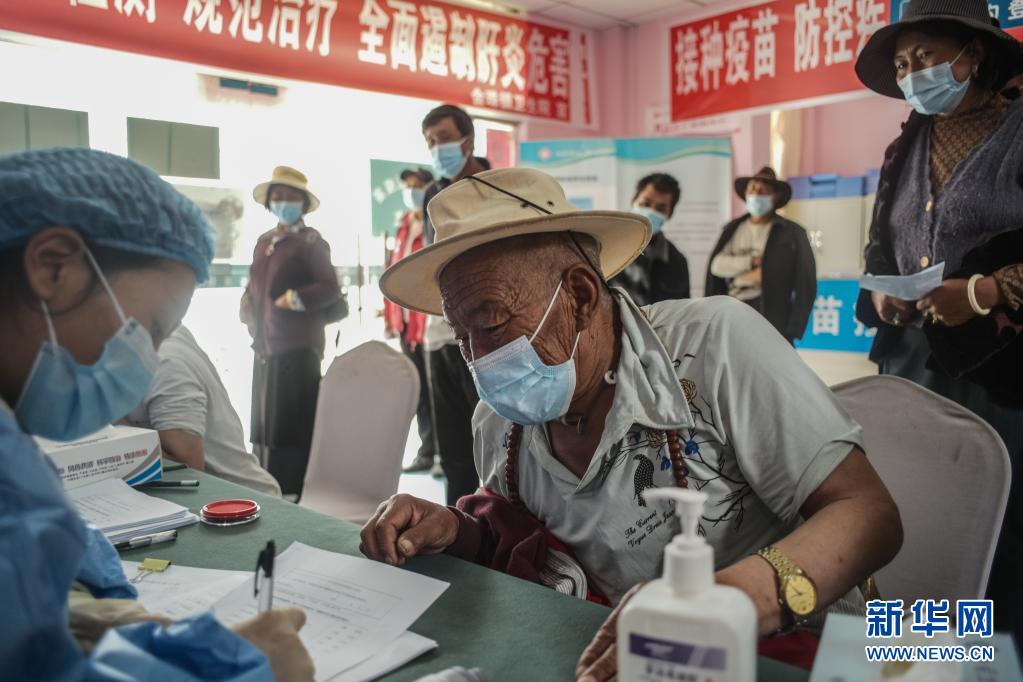 7月24日,在四川甘孜州稻城縣疫苗接種點(diǎn),工作人員為準(zhǔn)備接種人員扎波(中)登記信息。新華社記者 彭子洋 攝