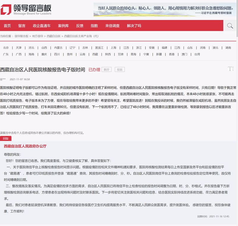 收到留言后,西藏自治區(qū)人民政府辦公廳高度重視,立即與西藏自治區(qū)衛(wèi)健委了解核實(shí),向這位網(wǎng)民致以歉意,并作了詳細(xì)答復(fù):