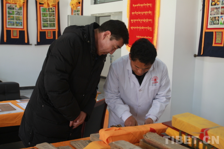圖為尼偉藏醫(yī)康復醫(yī)院負責人布地(右)向中國西藏網(wǎng)記者介紹古籍 攝影:登真巴珍
