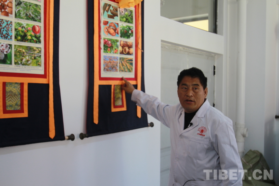 圖為尼偉藏醫(yī)康復醫(yī)院負責人布地介紹畫在唐卡上的生物 攝影:登真巴珍