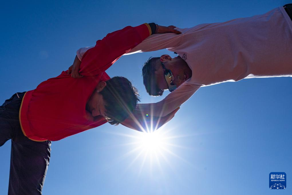 12月2日,索南加參(右)在西藏自治區(qū)競技體育管理中心和隊友一起拉伸。新華社記者 丁增尼達(dá) 攝