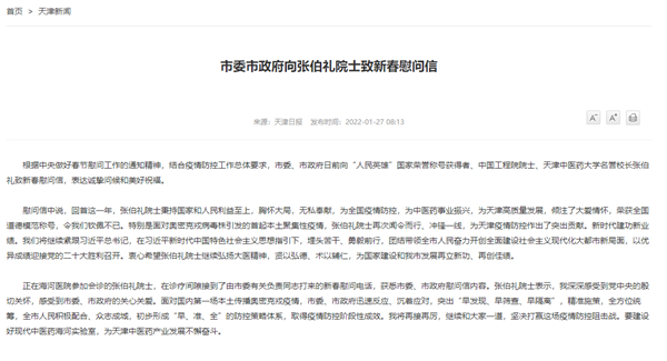 天津市委市政府向張伯禮院士致新春慰問信:胸懷大局,無私奉獻(xiàn)