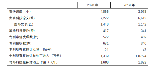 2020年全國(guó)中醫(yī)藥科研機(jī)構(gòu)在研課題共4,056個(gè),比2019年的3,978個(gè)增加了78個(gè),增幅2.0%。發(fā)表科技論文7,222篇,其中國(guó)外發(fā)表1,448篇,出版科技著作417種。比2019年全國(guó)中醫(yī)藥科研機(jī)構(gòu)發(fā)表的6,612篇科技論文增加了610篇,增幅為9.2%。
