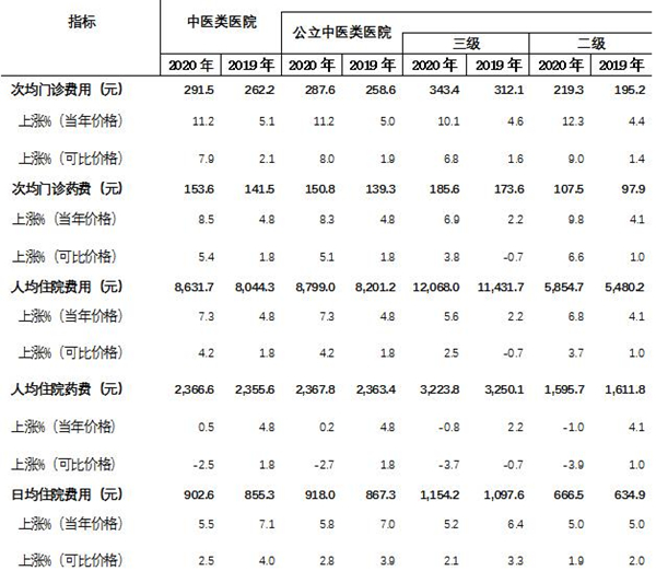 2020年中醫(yī)類醫(yī)院病人醫(yī)藥費(fèi)有何變化?《報(bào)告》顯示,2020年中醫(yī)類醫(yī)院次均門診費(fèi)用291.5元,按當(dāng)年價(jià)格比上年上漲11.2%,按可比價(jià)格上漲7.9%;人均住院費(fèi)用8,631.7元,按當(dāng)年價(jià)格比上年上漲7.3%,按可比價(jià)格上漲4.2%。日均住院費(fèi)用902.6元。