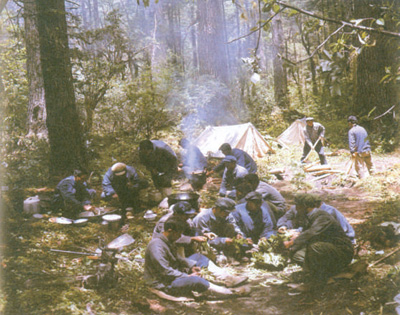 圖為書中插圖:考察隊員在林間宿營地做早餐。