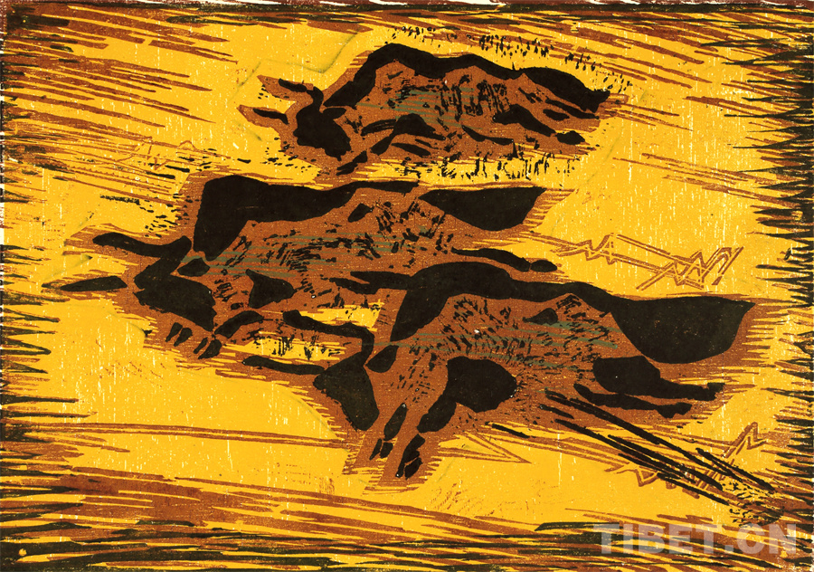 如果非要說我在版畫技法上有什么創(chuàng)新,參照西藏匠人刻經(jīng)文,在石頭上刻出來然后印出來也許就算。這不是一般石版畫概念,那叫石印,平版印刷;我這是凹版印刷。刻起來很費(fèi)勁,我也不管費(fèi)不費(fèi)勁。我有一批這樣的石刻作品。綜合版作品手法較多,我通常分別在石板和木板上刻,然后套起來印。如果搞學(xué)術(shù)交流,也許值得一談。至于說到創(chuàng)新,第一我不認(rèn)為我有什么創(chuàng)新,第二我不認(rèn)為在藝術(shù)上、在美術(shù)上能夠輕易談創(chuàng)新這個(gè)詞。還有第三個(gè)觀點(diǎn):不需要?jiǎng)?chuàng)新。很簡單,你先把傳統(tǒng)學(xué)到手再說。既是傳統(tǒng),就有它的存在理由,否則早就夭折了,還傳什么統(tǒng)呢?傳,而且統(tǒng)??!統(tǒng)是什么意思?基調(diào)是它統(tǒng)一起來的。先把傳統(tǒng)學(xué)到手,爐火純青了,神來之筆出現(xiàn)了,才有可能有所創(chuàng)造?;A(chǔ)是重要的。