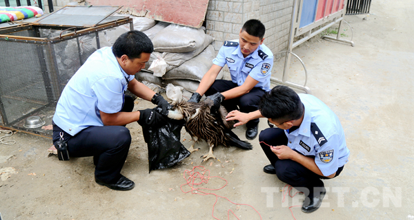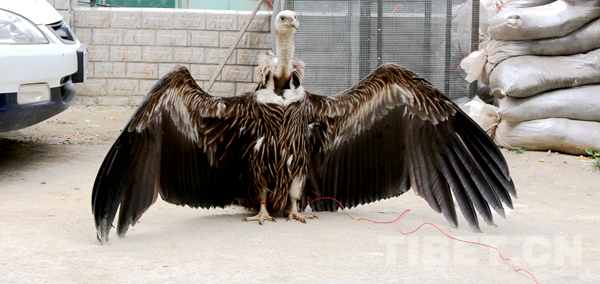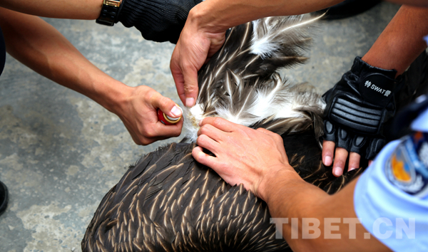過了一會兒,正在路邊施工的工人發(fā)現(xiàn)了我,他們立即打電話。后來我才知道,他打到了丹巴縣環(huán)林局野保科(這可是專門負(fù)責(zé)保護動物的機構(gòu)喔)。隨后,就見有穿制服的工作人員來了,救星啊!他們給我檢查了身體,發(fā)現(xiàn)了我右爪脫臼傷情,就把我?guī)Щ氐搅说ぐ蜕止簿帧?/p>