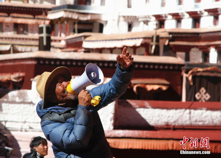 來自美國加利福尼亞州的游客Tim游覽布達拉宮時,遇到排隊上山粉刷的信眾,豎起大拇指為他們點贊。中新社記者 趙延 攝