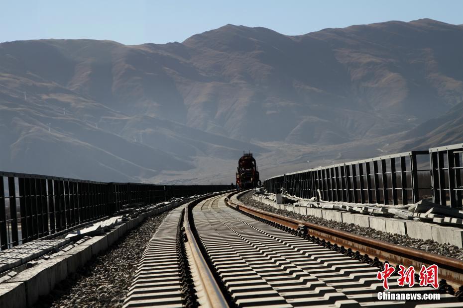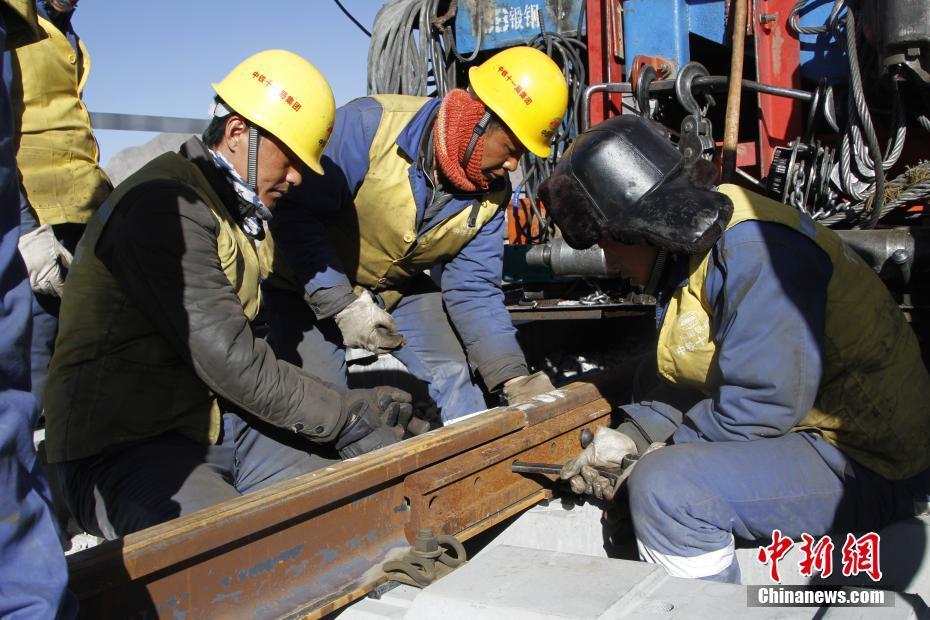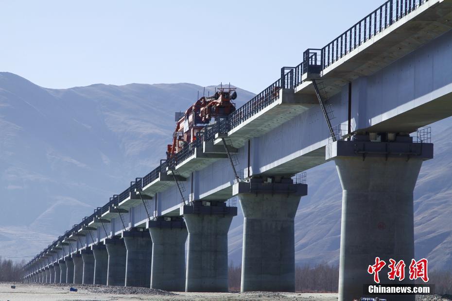 11月26日,中鐵十一局三公司拉林鐵路項目部鋪架二隊工人鋪設(shè)拉林鐵路首跨貢嘎雅魯藏布江特大橋鐵軌。拉林鐵路共計上跨雅魯藏布江16處,貢嘎雅魯藏布江特大橋全長5727米,為拉林鐵路全線最長橋梁。拉林鐵路起于西藏自治區(qū)首府拉薩,終點為林芝市,拉林鐵路新建正線鋪軌403.14千米,運營長度435.48千米。中新社記者 趙朗 攝