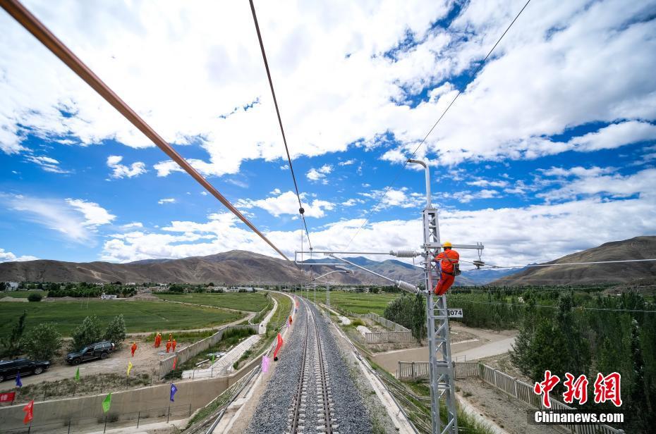 7月6日,中國中鐵電氣化局施工人員對拉林鐵路接觸網(wǎng)專業(yè)首件工程進(jìn)行復(fù)檢。當(dāng)日,川藏鐵路拉薩至林芝段(簡稱“拉林鐵路”)接觸網(wǎng)專業(yè)首件工程在西藏山南市扎囊至扎其區(qū)間成功建成,這為全線施工確定了規(guī)范和標(biāo)準(zhǔn),至此拉林鐵路也進(jìn)入了全線電氣化大規(guī)模施工階段。 拉林鐵路正線全長435.48公里,是西藏首條電氣化鐵路,正線共需架設(shè)接觸網(wǎng)540.63條公里,設(shè)計時速160公里。中新社記者 何蓬磊 攝