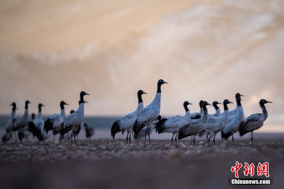 2月17日,西藏拉薩市林周縣黑頸鶴保護(hù)區(qū)內(nèi),黑頸鶴嬉戲、覓食。中新社記者 何蓬磊 攝