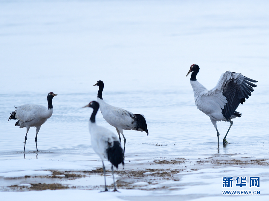 10月21日在三江源國(guó)家公園黃河源園區(qū)內(nèi)拍攝的黑頸鶴。新華社記者 張龍 攝