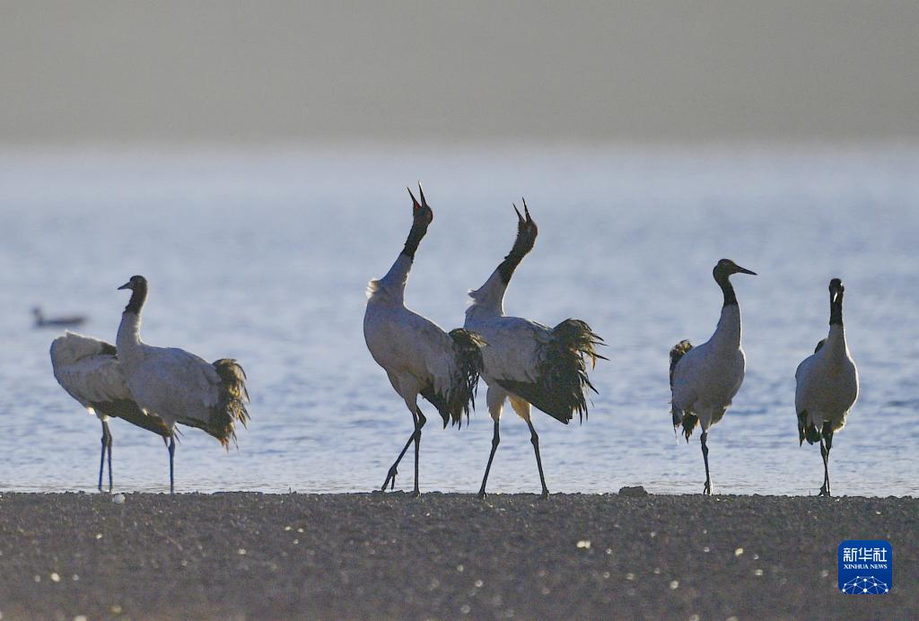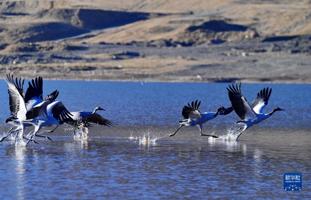 這是在林周縣虎頭山水庫(kù)拍攝的黑頸鶴(12月7日攝)。新華社記者 張汝鋒 攝