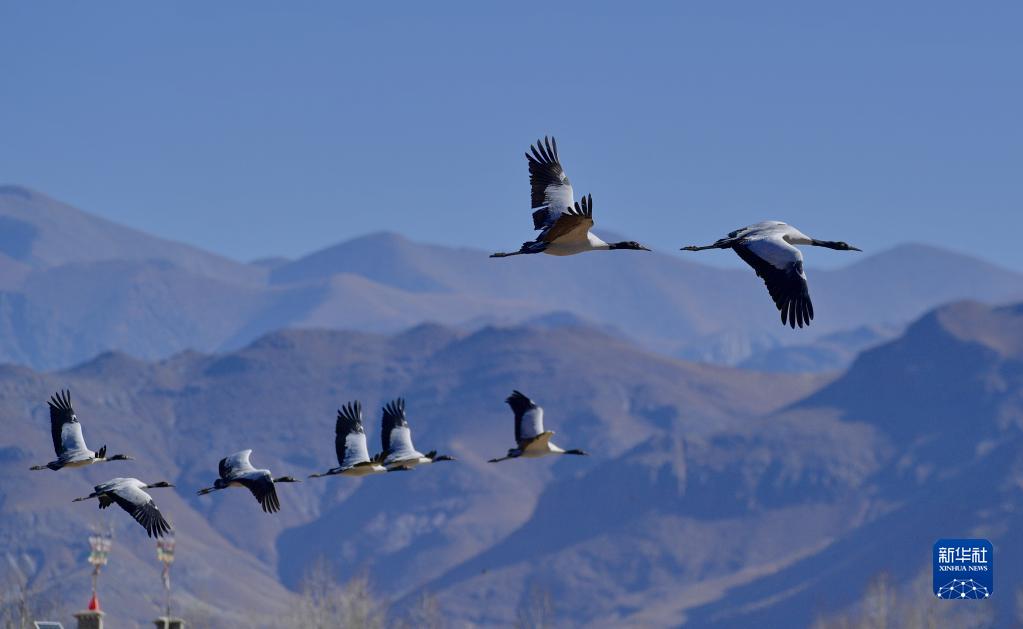 黑頸鶴在林周縣的山巒間翱翔(12月7日攝)。新華社記者 張汝鋒 攝