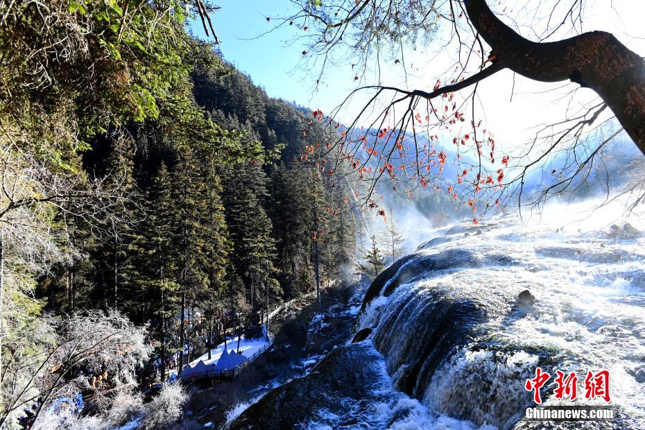 1月5日,冬日的九寨溝一片銀裝素裹的景象,顯得格外的寂靜,仿佛人間仙境。圖為航拍火花海風光。安源 攝
