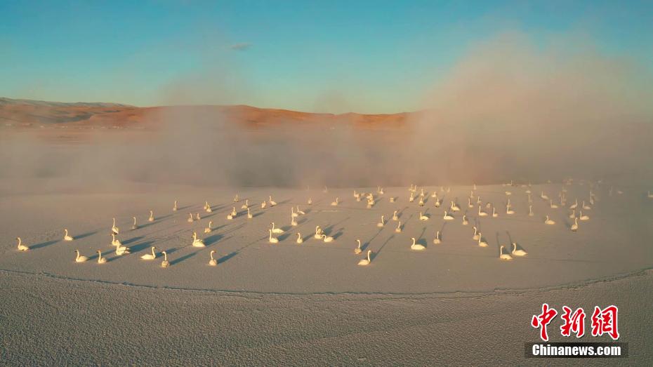 青海湖畔大天鵝集體“泡湯”畫面唯美