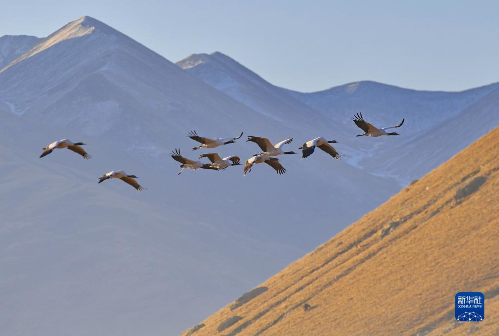 黑頸鶴在拉薩市林周縣飛翔(1月8日攝)。新華社記者 黃豁 攝