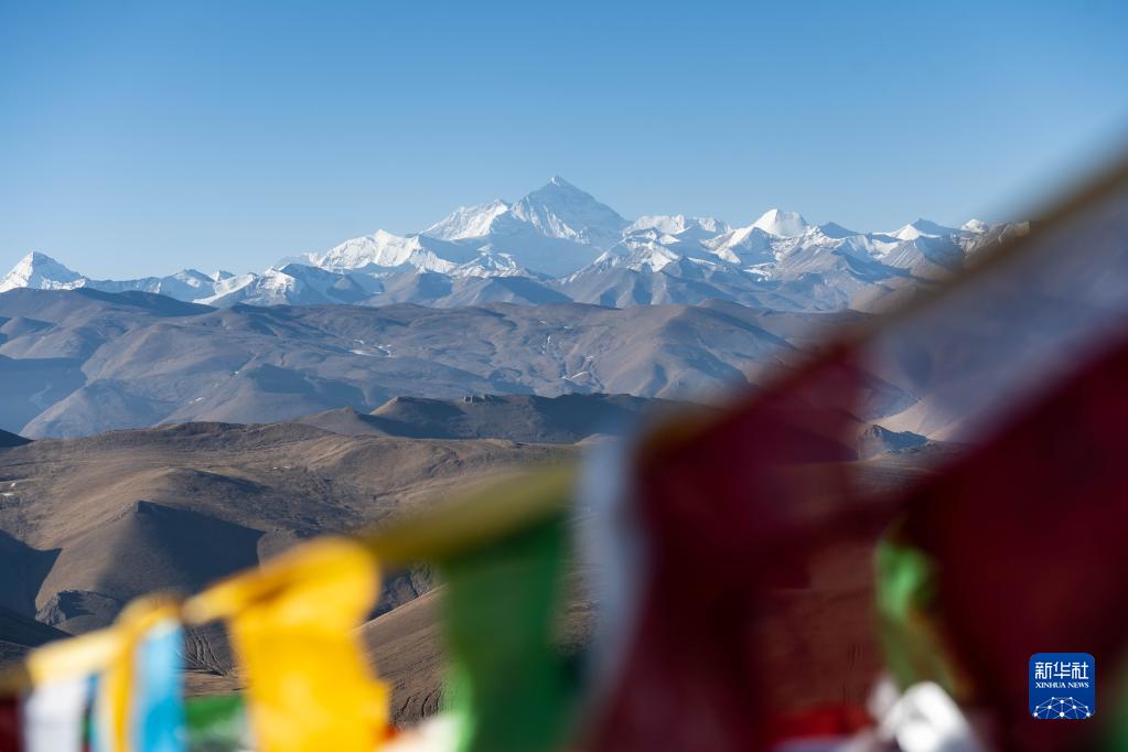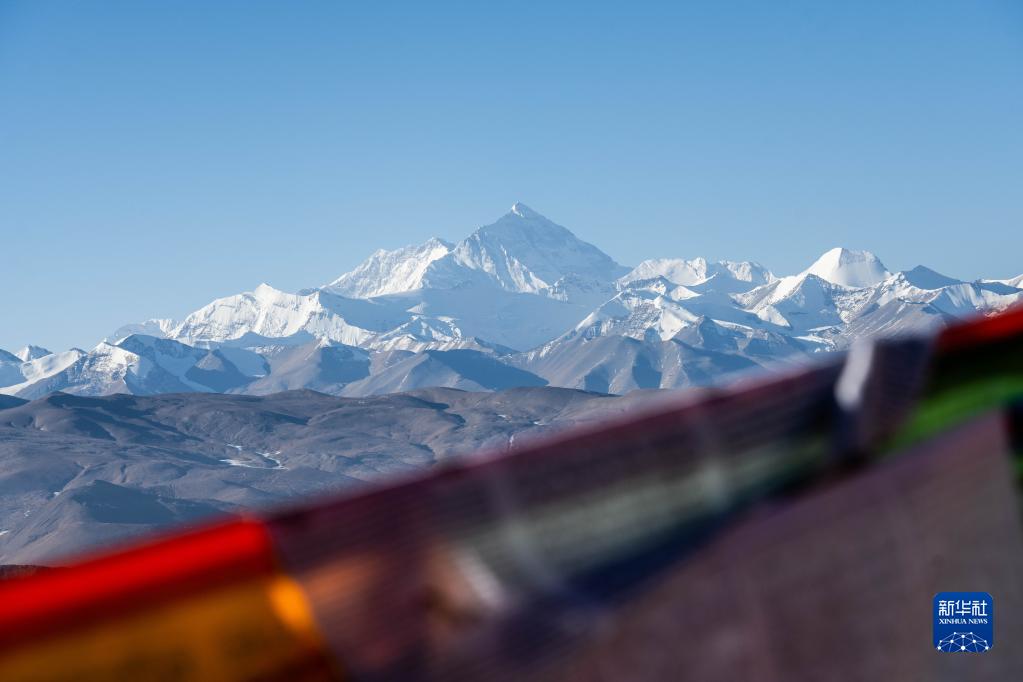 這是3月15日在西藏日喀則透過藍色經(jīng)幡拍攝的珠穆朗瑪峰。新華社記者 周荻瀟 攝