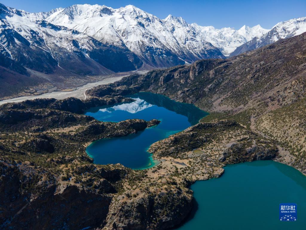 黑湖映射出雪山的倒影(4月2日攝,無人機(jī)照片)。新華社記者 周荻瀟 攝