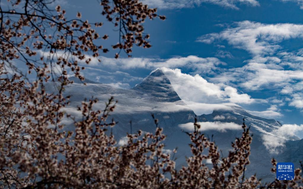 這是在波密縣拍攝的桃花掩映下的雪山(4月18日攝)。新華社記者 晉美多吉 攝