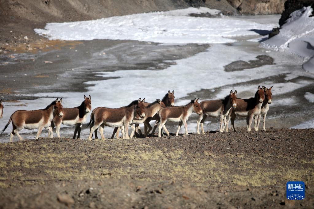 一頭藏野驢在位于西藏自治區(qū)山南市措美縣的哲古錯(cuò)旁吃草(2021年12月4日攝,手機(jī)照片)。新華社記者 沈虹冰 攝