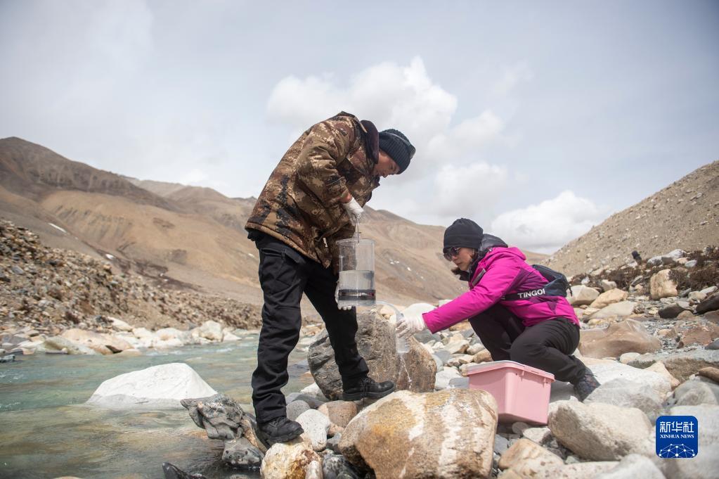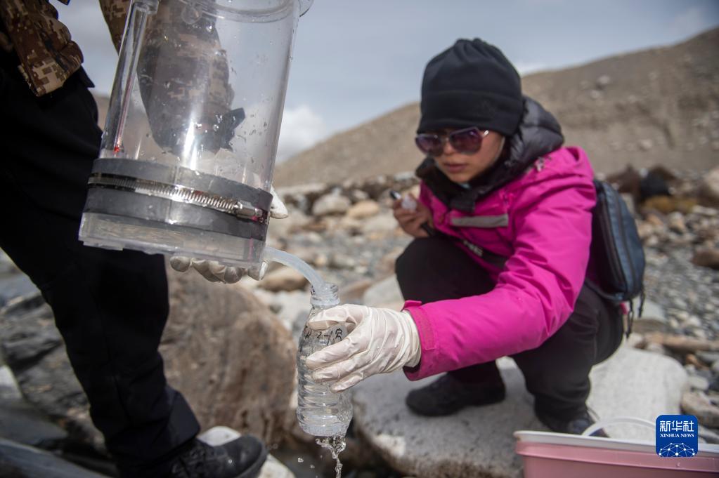 在東絨布冰川區(qū)域,科研人員進(jìn)行微生物指標(biāo)水樣采集(4月30日攝)。新華社記者 旦增尼瑪曲珠 攝