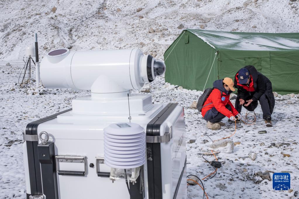 在珠峰登山大本營,科研人員給激光測風(fēng)雷達(dá)布線(4月30日攝)。新華社記者 孫非 攝