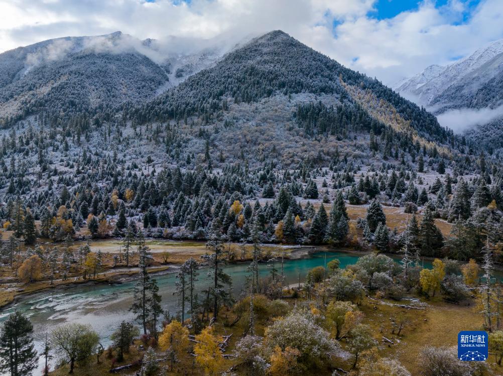 時(shí)值金秋,西藏林芝市秋色已濃,黃葉與初雪交織,流水并雪山輝映,景色如詩如畫。