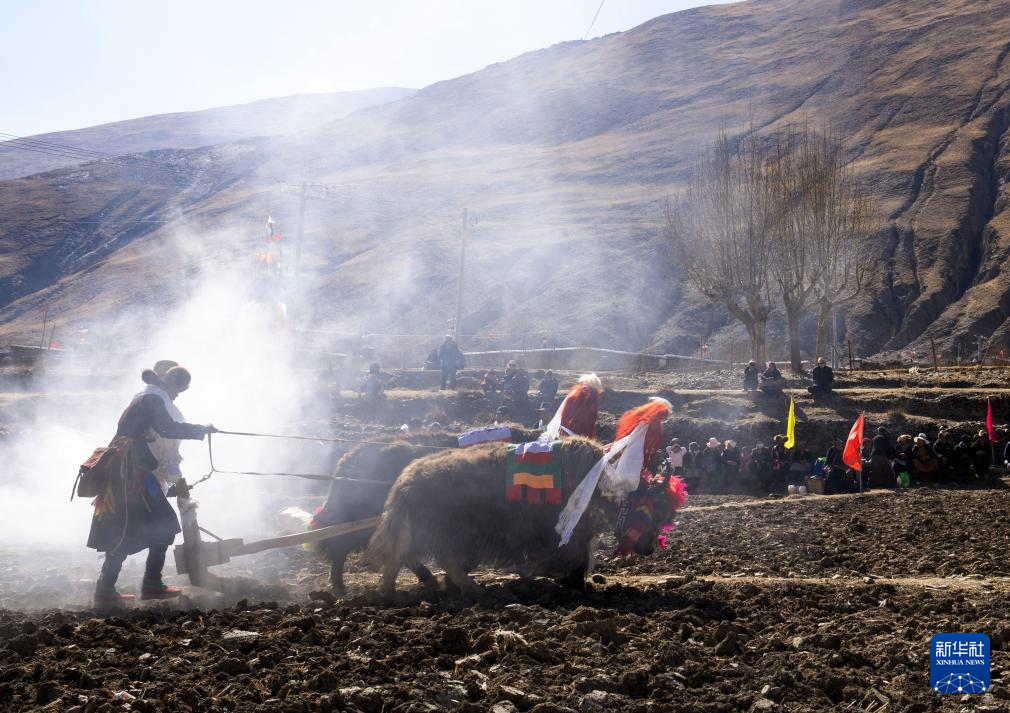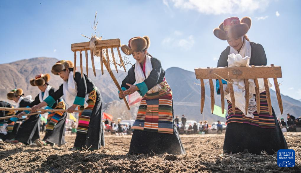 當(dāng)日是西藏農(nóng)民舉行一年一度春耕大典的日子。村民沿襲著傳承千年的春耕民俗,身著節(jié)日盛裝,手捧“切瑪”(五谷豐登斗),唱起祈愿歌,互敬青稞酒。當(dāng)鐵犁翻開(kāi)土地,婦女將手中的種子撒下,祈求新的一年豐收。