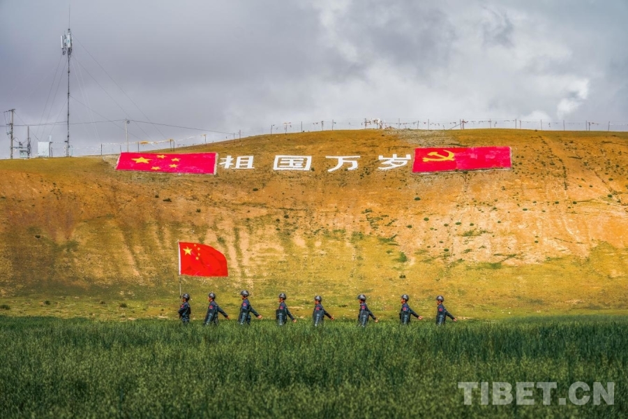 西藏日喀則市崗巴縣崗巴鎮(zhèn)吉汝村有一塊地勢(shì)較高的山坡,2021年,當(dāng)?shù)卮逦瘯?huì)用石頭和混凝土在斜坡上砌了一面黨旗和一面國旗,中間有“祖國萬歲”四個(gè)白色大字,在村口就能看見這處景觀,十分醒目。每年國慶節(jié)前夕,派出所都會(huì)組織駐地干部群眾來這里刷新描紅,只要沒休假,嘎色每次都會(huì)參加。