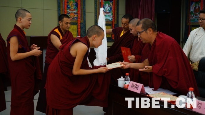 參加此次培訓(xùn)的學(xué)僧,雖然年齡小,但都表現(xiàn)出勤奮刻苦的精神面貌。有7名學(xué)員在西黃寺受沙彌戒,因緣殊勝。其中,云丹凱卻以綜合成績排名第一被評為優(yōu)秀學(xué)員,拿到了獎(jiǎng)學(xué)金。他在發(fā)言中表示:“經(jīng)過近一年的努力,我們收獲滿滿,佛學(xué)水平有了很大提升,辯經(jīng)能力得到鍛煉,藏漢雙語水平明顯加強(qiáng)”,“下周我們將前往甘青藏藏傳佛教寺廟進(jìn)行辯經(jīng)實(shí)習(xí),現(xiàn)在感到特別高興。在中國學(xué)習(xí),受益匪淺,心懷感恩?!?/p>