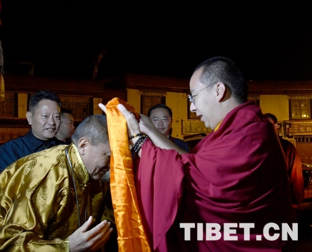 十一世班禪乘車(chē)抵達(dá)大昭寺時(shí)法號(hào)齊鳴、鼓樂(lè)喧天。早已迎候在此的中國(guó)佛協(xié)西藏分會(huì)會(huì)長(zhǎng)珠康?土登克珠向十一世班禪敬獻(xiàn)哈達(dá),表達(dá)僧眾對(duì)他的衷心擁戴。