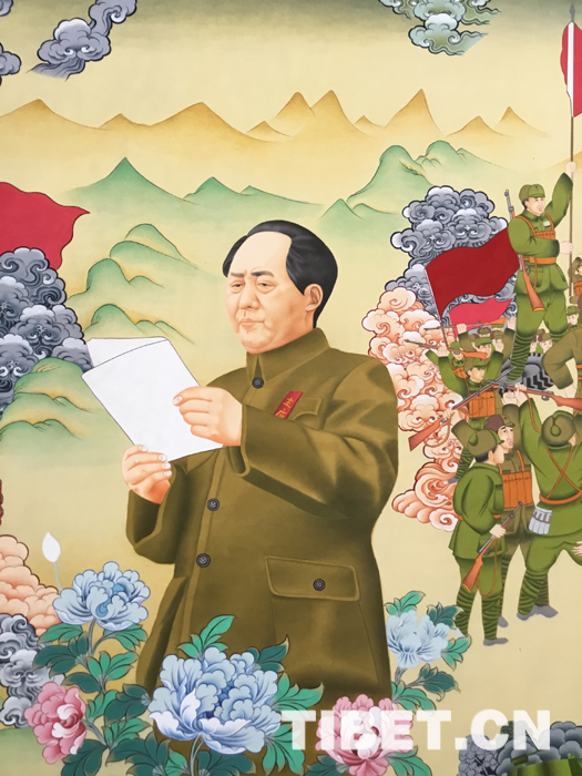 中國西藏網(wǎng)訊 據(jù)悉,由“華銳唐卡藝術傳習所”唐卡代表性傳承人扎西多杰設計創(chuàng)作的紅色文化唐卡《世界偉人——毛澤東》即將完工,將在2019年問世。